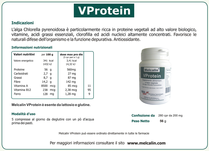 Il suo elevato contenuto in sostanze attive lo rende un prodotto indicato per vari disturbi: stimola il sistema immunitario, offre protezione dalle infezioni ed esercitare una significativa attività antitumorale oltre a concorrere nella riduzione della pressione sanguigna e abbassare i livelli sierici di colesterolo. Melcalin Vprotein è un supplemento al 100% di Chlorella pyrenoidosa, il suo alto contenuto in proteine, minerali e vitamine lo rende un prodotto interessante da un punto di vista nutrizionale e terapeutico. Può quindi essere indicato per migliorare le difese immunitarie, per avere un’azione chelante nei confronti dei metalli pesanti e per fornire un adeguato apporto di proteine e aminoacidi in caso di carenza proteica come conseguenza, per esempio, di un’alimentazione vegetariana o vegana.