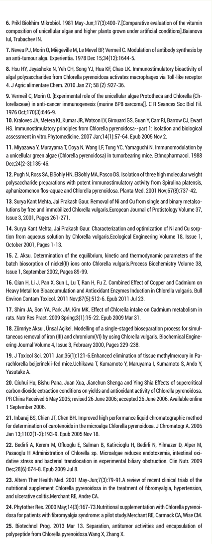 Altre ricerche hanno evidenziato che l’aumento della quantità di biomassa di chlorella aumenta la quantità di Cromo che viene legato18 e inoltre che l’assunzione di preparati a base di chlorella accelerano l’escrezione di Mercurio, diminuendo in tal modo i livelli tissutali del metallo19.