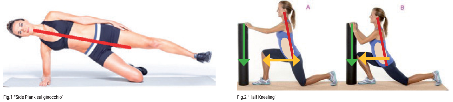 framma faccia il suo dovere, si inizia dalla stabilità, scegliendo quella posizione che, da un lato, compatti il tronco di modo che funzioni come trasduttore delle forze in gioco e, dall’altro, coinvolga al massimo e quindi “costringa” il complesso dei muscoli glutei a compiere il lavoro di stabilizzatori articolari di modo che le funzioni abduttorie ed estensorie dell’anca siano libere di esprimersi. Nella versione Fitness lo si presenta come plank laterale con appoggio al ginocchio (fig1).