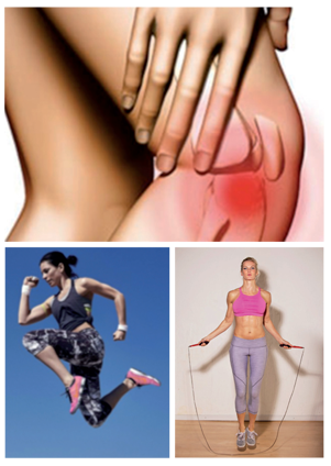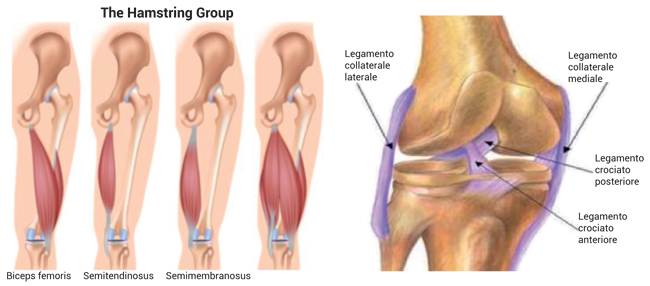 • Una più inefficace co-contrazione (ritardo neuromuscolare) e un “disequilibrato” sviluppo di forza tra quadricipite e muscoli posteriori della coscia (Ischiotibiali o Ischiocrurali o hamstrings) (quindi > impatto al suolo e < ammortizzazione nei salti per > rapporto di forza quadricipite/hamstrings).
